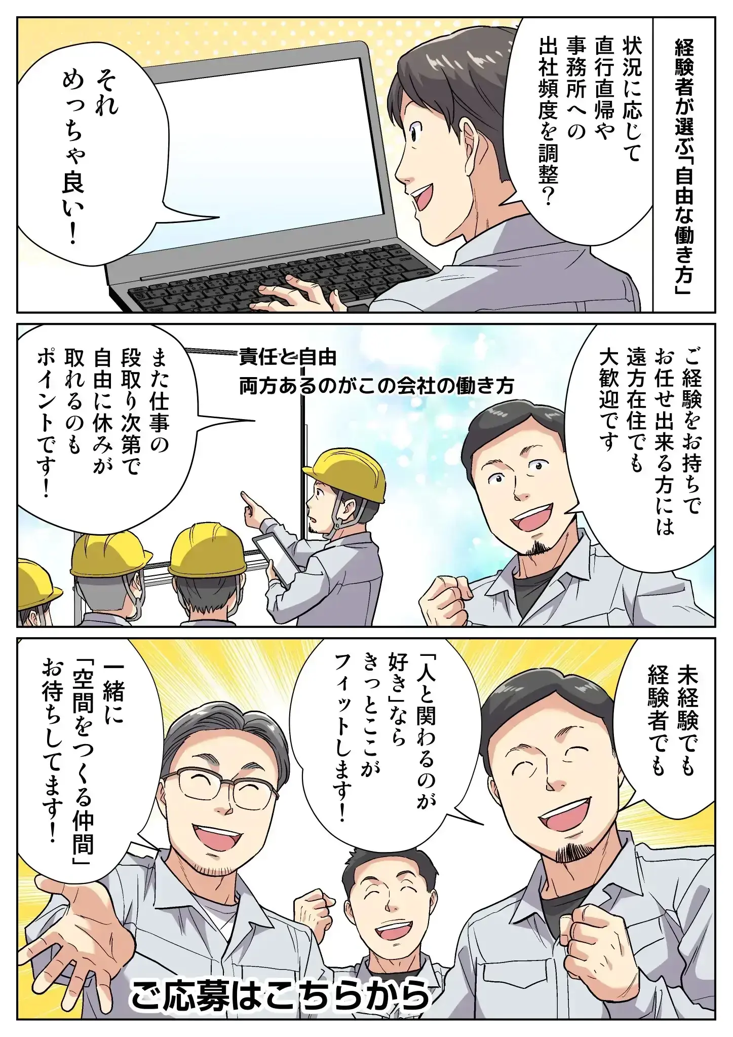 空間をつくる仕事は、チームでつくる仕事。人と関わるのが好きな人にこそ、ぴったりな職場です。